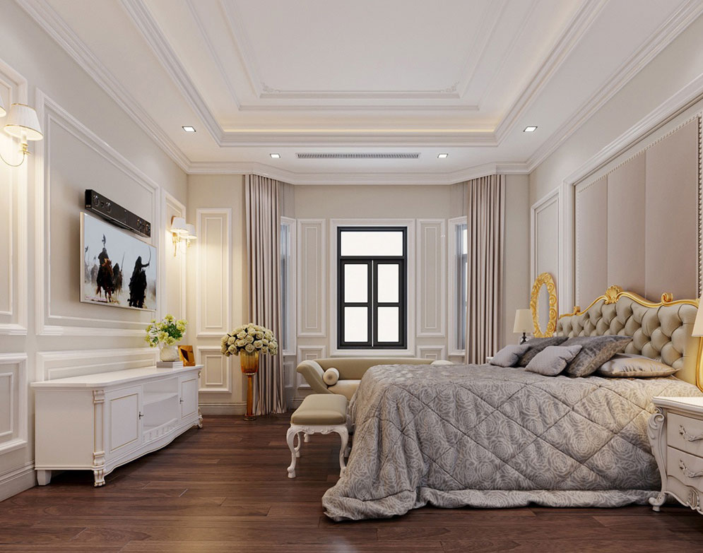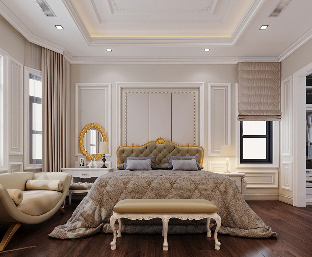 Phòng ngủ chính của biệt thự pháp 3 tầng mặt tiền 11m được thiết kế rất hài hòa, khoa học với màu be chủ đạo.