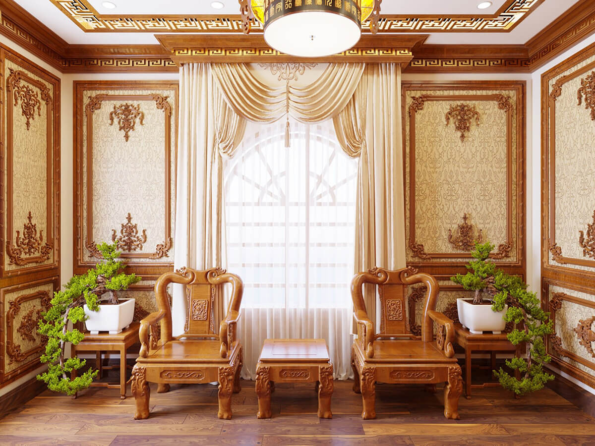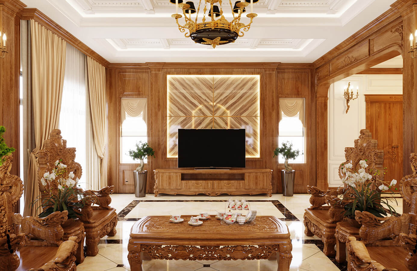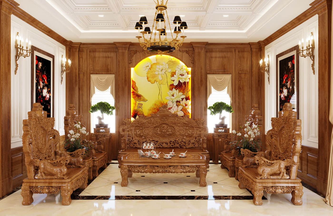 Sử dụng phào chỉ, gỗ ốp tường đem đến sự trọn vẹn về mặt hình khối kiến trúc, cũng như sự sang trọng và đẳng cấp cho không gian tiếp khách.