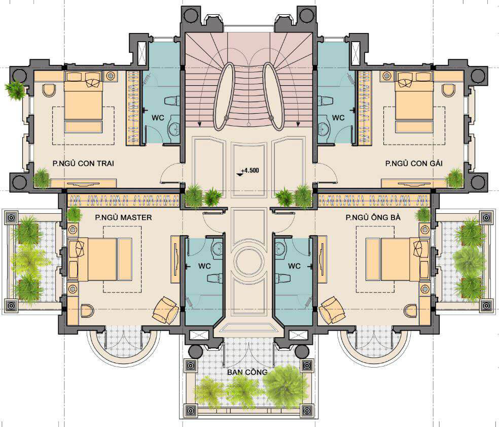 Lầu 1 gồm: Phòng ngủ master, phòng ngủ ông bà, phòng ngủ con trai, phòng ngủ con gái