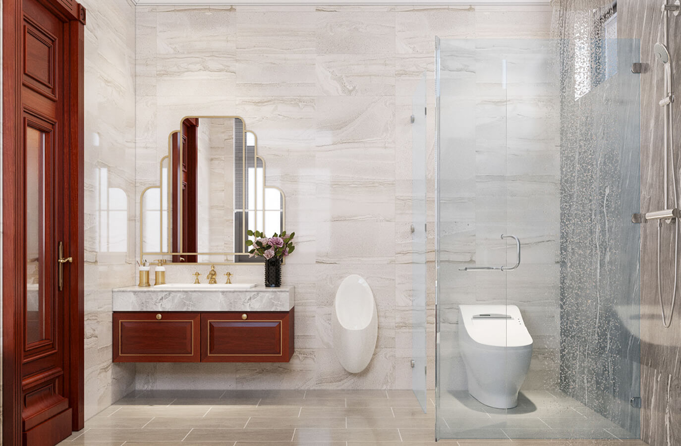 Tầng trệt gồm: Sảnh chính, phòng khách, phòng ăn, phòng karaoke, phòng bếp